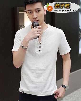 潮流男装搭配一,将V领与纽扣成功结合在一起的上衣,既有POLO衫的时尚魅力,同时又保持着T恤的特色。另外,服饰的纯白色配色,搭配黑色的紧身裤,可表现出穿着者干净利落的穿搭风格。