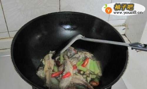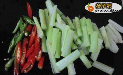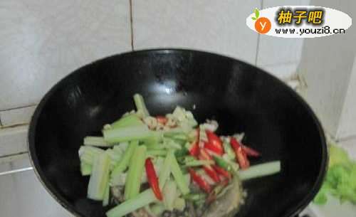 8西芹辣椒下锅一起炒,再放姜,蒜,盐