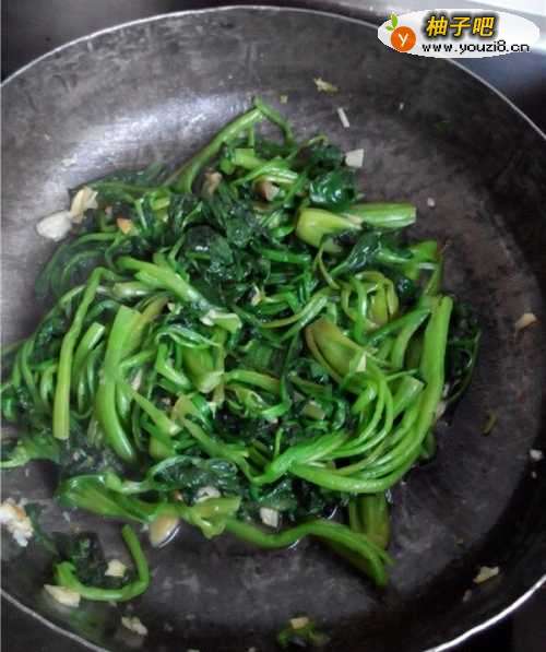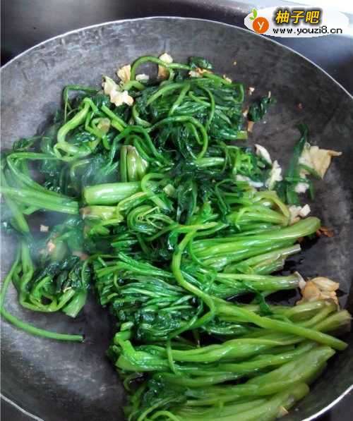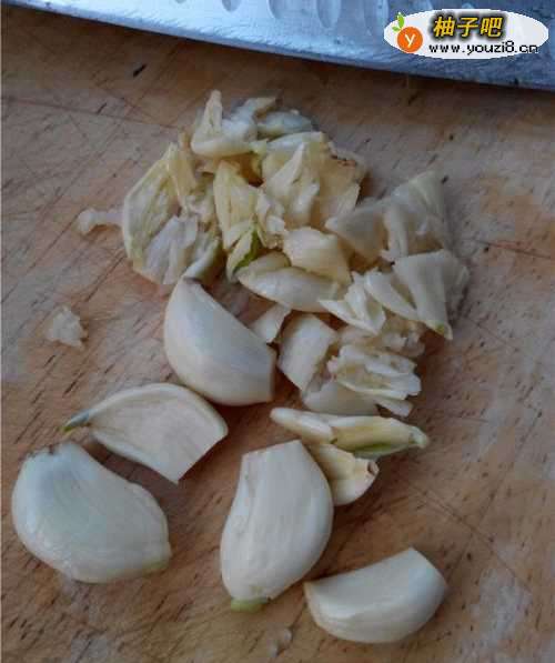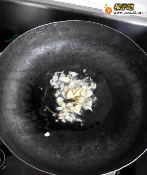 7锅烧热,放入油烧热,放入大蒜炸香。