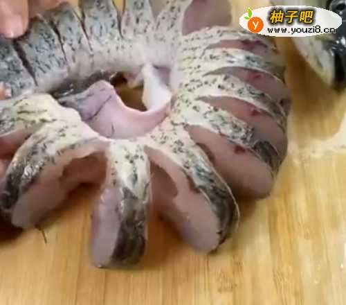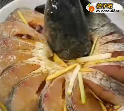 草鱼清洗干净,鱼头切下,背部改刀。