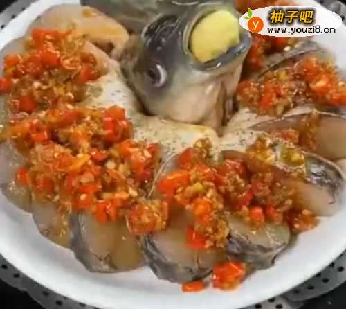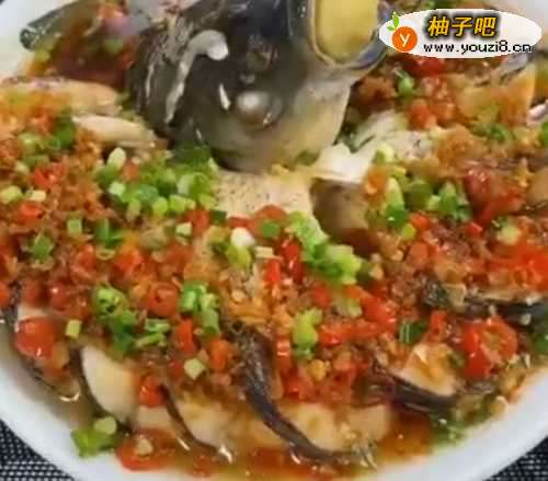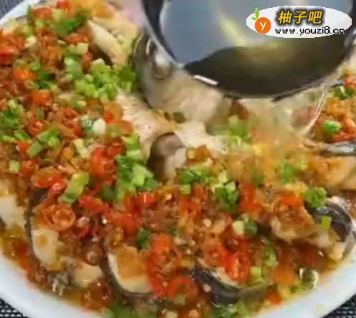 4把做好的小米辣酱料淋在草鱼上。
