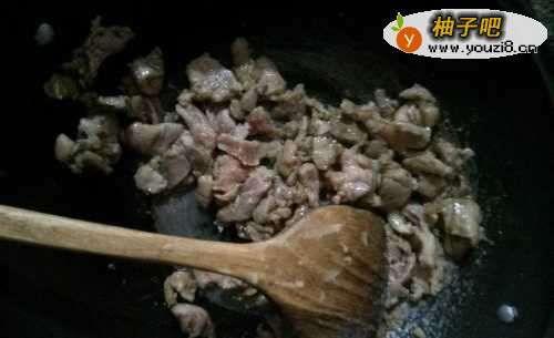 4开火,加入食用油,将瘦肉下入锅里翻炒;