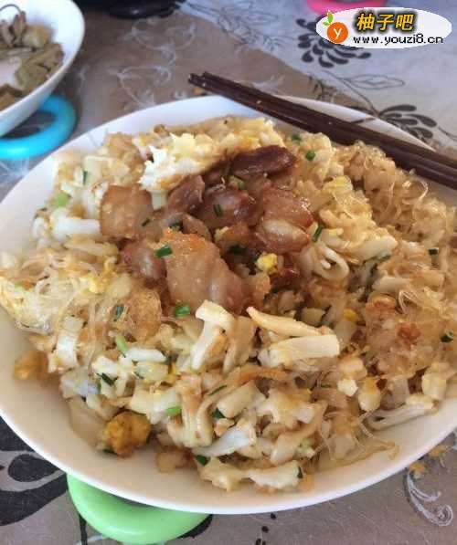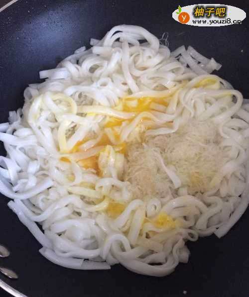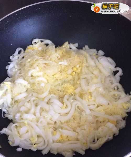 4快速翻炒,让粉都沾上油之后就静置等粉丝热透,拨开中间,加点油,把鸡蛋打进去(或者提前把鸡蛋打散);