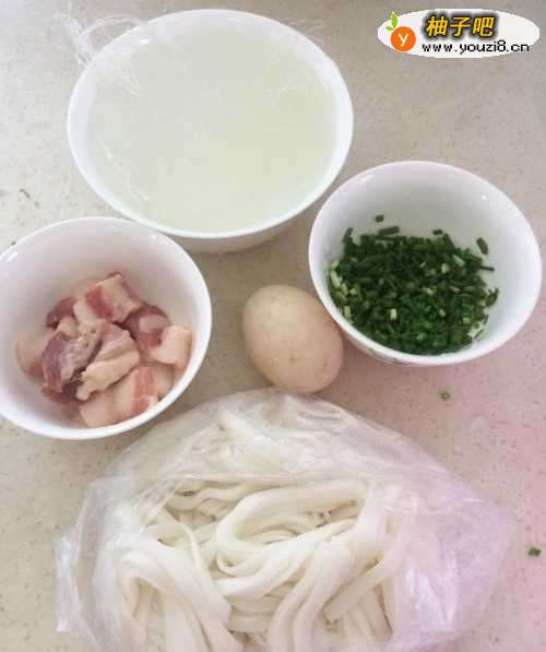 准备好所有材料,五花肉切小片、香葱切小、米粉泡水备用;