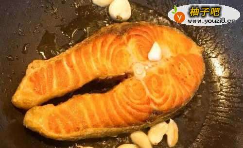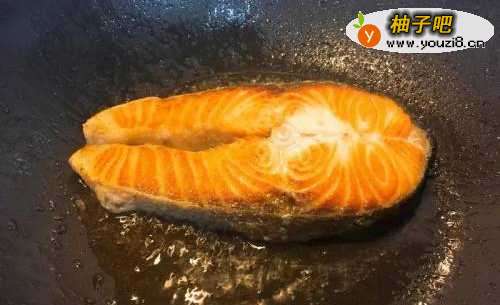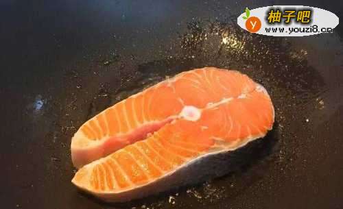 2热油锅中火,倒入少许的橄榄油再将鲑鱼放入锅中干煎