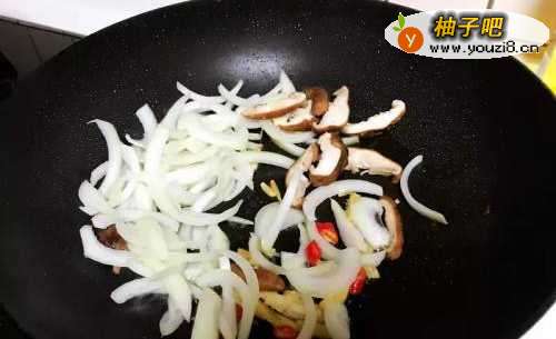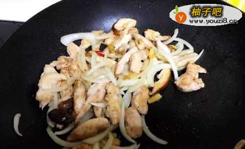 5保留煎鸡柳时的油,用中火爆香蒜片、辣椒和姜,放入洋葱、香菇,炒至略带金黄色