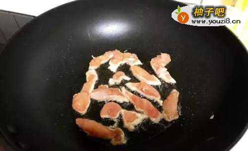 6放入鸡柳,加一点辣酱、盐调味,略为翻炒