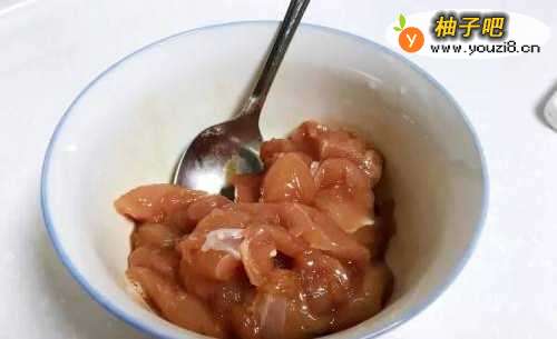 鸡柳切块后,加入酱油、米酒、生粉、糖腌10-15分钟