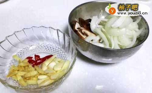 2蒜头切片,小辣椒切段,姜、洋葱、香菇切细条