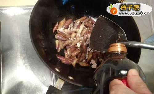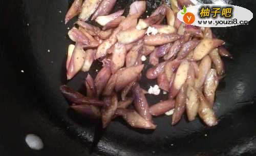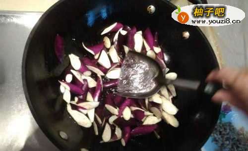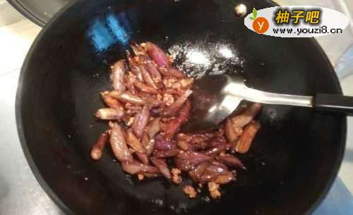 5茄子炒至干瘪,铲子按茄子柔软后,如图: