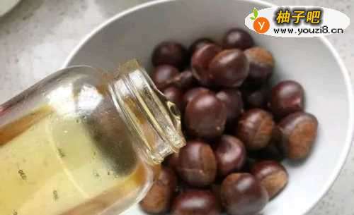 4把剪好的板栗,放入大碗里,倒入玉米油,拌匀。这时候把烤箱预热,设置上下管200度。