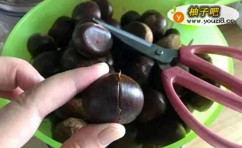3把板栗用剪刀,直着剪个口子,和板栗长度一样长,这样烘烤的时候,板栗张开的快,方便蜂蜜入味。