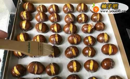 8烘烤15分钟时,板栗已经张开口了,戴着手套把板栗端出来,在板栗开口处,刷上一层蜂蜜水,挨个刷好,再次放入烤箱中层,烘烤10分钟,出炉。趁热剥开,尝一尝,软糯香甜。