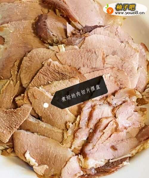 把瘦肉焯水后,水中加入姜和大葱煮半小时筷子能戳透,捞起来放冰箱冷藏,冷却后切片。