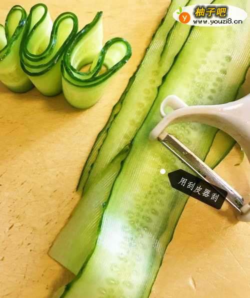 3把黄瓜用刮皮刀削成薄片卷起来摆在肉片上旁边,一口肉一口黄瓜,味道太好啦!
