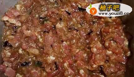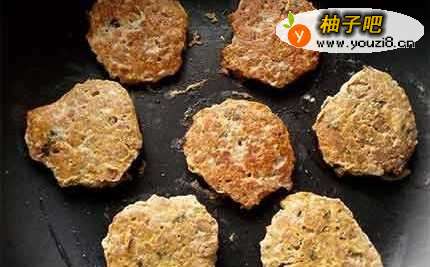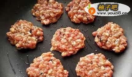 2不沾平底锅倒少许油热锅,再用汤匙舀肉馅入锅中,摊开成饼状。