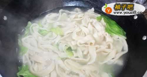 5水开后,用双手捏住面的两端,将它扯长,放入锅中煮熟。
