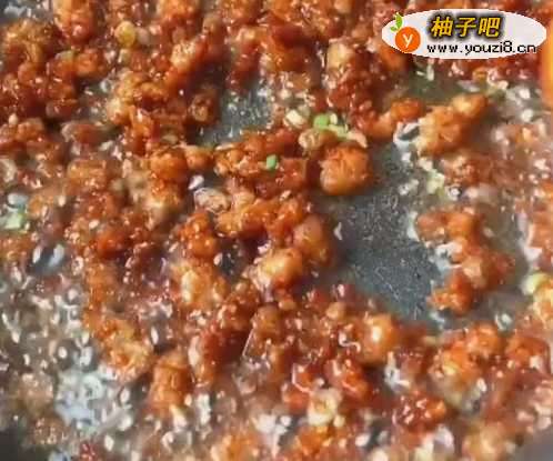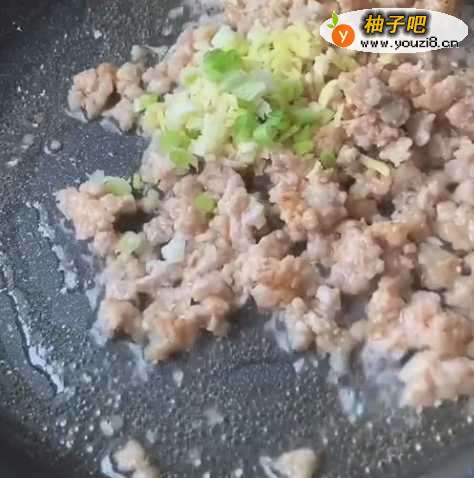 5锅中留油加入肉末,加葱姜蒜炒香