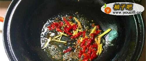 4锅中底少许底油,下生姜丝,花椒,辣椒煸炒,出香味后下之前炸好的虾。