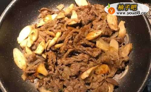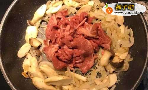 5将洋葱和杏鲍菇拨放到锅的另一边,接下来放入腌好的牛肉片煎炒