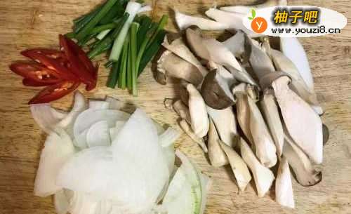 2洋葱去皮后对切,再切细丝;杏鲍菇滚刀切;葱切段;辣椒斜切