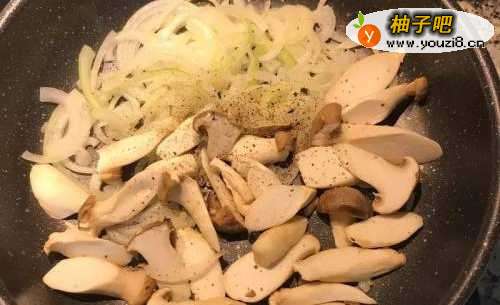 4放入杏鲍菇,并加入黑胡椒粉一起拌炒到略微上色后