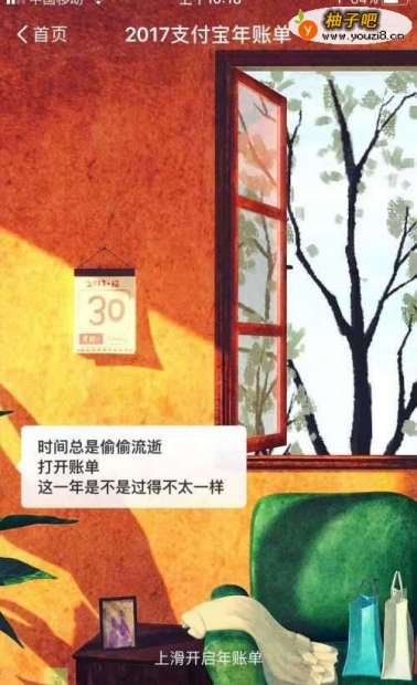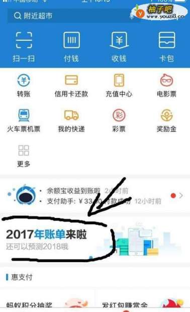 2在界面首页的中间,如下图所示地方,我们可以看到“2017年账单”的字样,点击;