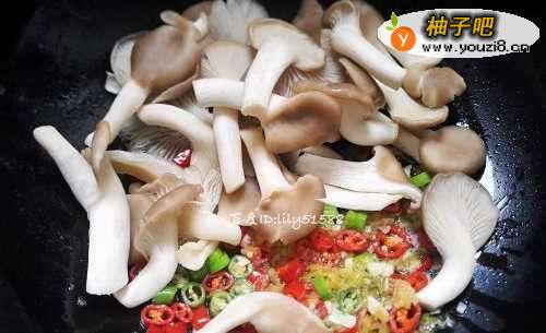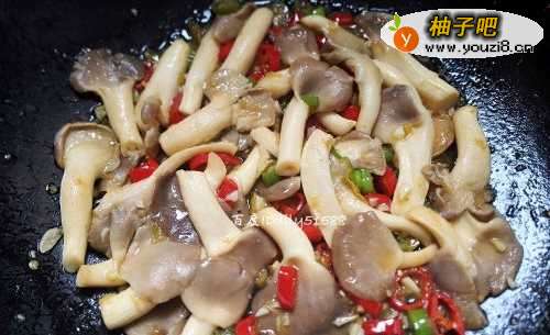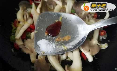 5平菇炒软之后,加入少许盐,五香粉,蚝油调味。