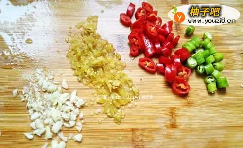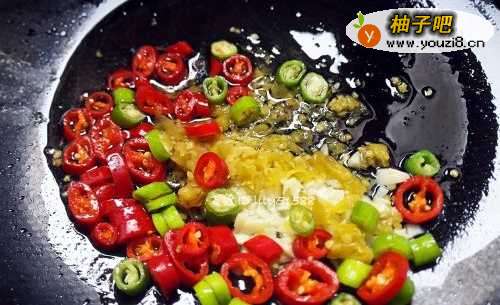 3烧热锅放入少许油,把青、红尖椒,泡椒,蒜末一起放入锅里用大火爆香。