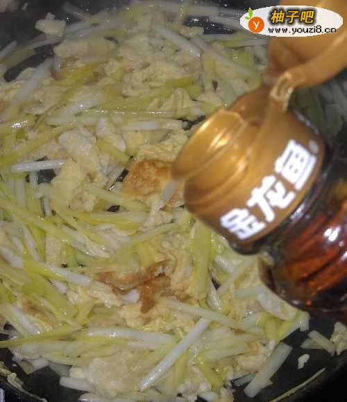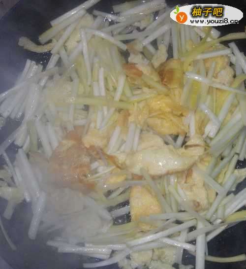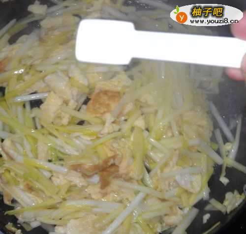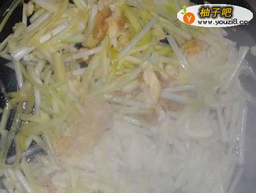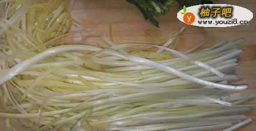 4放入韭黄的梗部分。翻炒炒几下