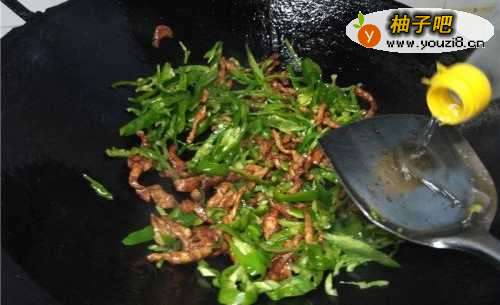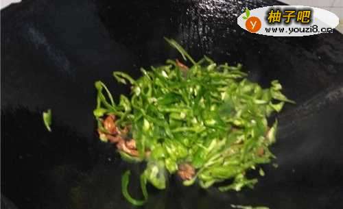 6将青椒丝倒入锅中,一同翻炒,加入食盐入味。