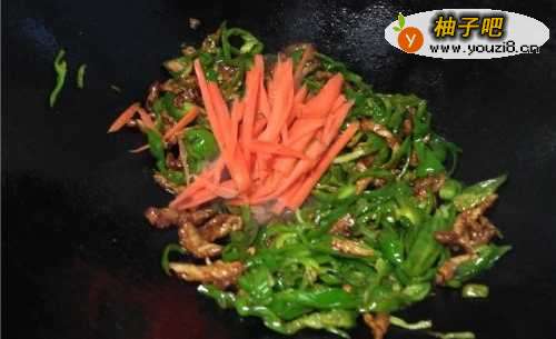 9最后加入胡萝卜丝,一同翻炒。