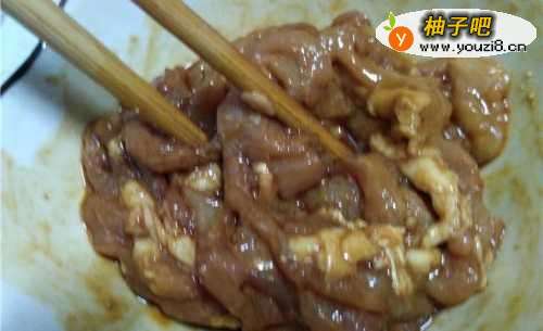 2猪肉切成丝,拌上淀粉以及酱油,搅拌均匀。