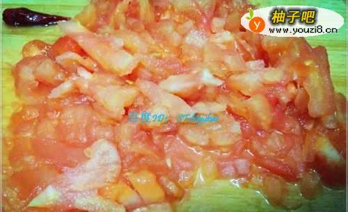 7待翻炒一阵后,倒入切好的西红柿末,大火快炒一会,然后加入适量的蕉丽水,大火将水炖干。