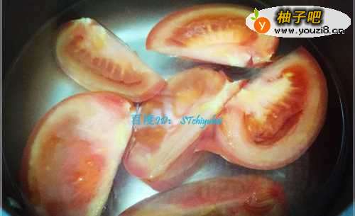 3准备一到两个西红柿,将其清洗干净,沿着中心切成小瓣状,剜去蒂头部分。