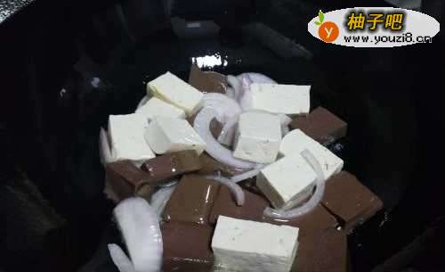 3起锅烧油,加洋葱丝爆香,加焯水的鸭血豆腐翻炒!
