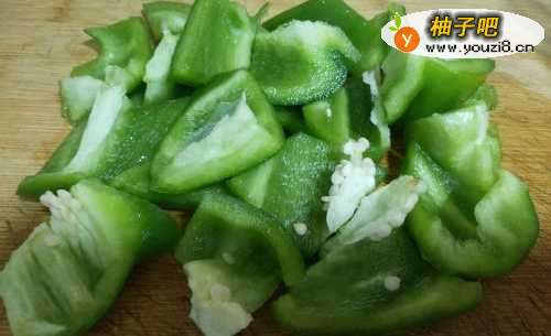 青椒去蒂去籽,切成斜刀块,洋葱切成细条!