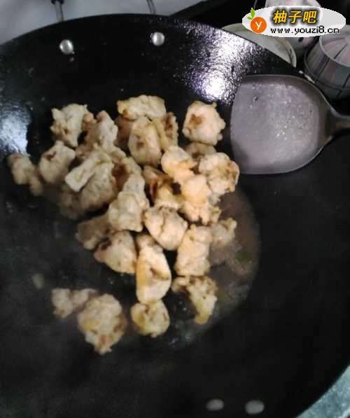 7第七步,然后在锅里倒入炸好的茄子,翻炒一会。
