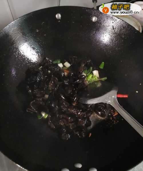 5第五步,把木耳沥水以后倒入锅中翻炒。