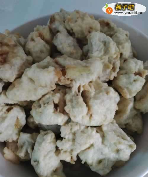 第一步,先把茄子去皮切块后在油锅里煎炸一会装盘。