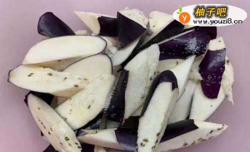 茄子切滚刀块后撒上少许盐抓一下,均匀放置约15分后挤干茄子水分备用