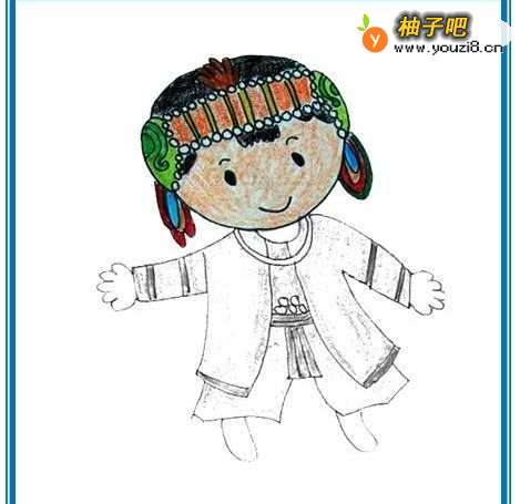 5用油画棒把人物身体及服饰部分涂色,民族服装图片简笔画已完成,如下图所示。