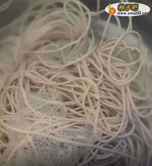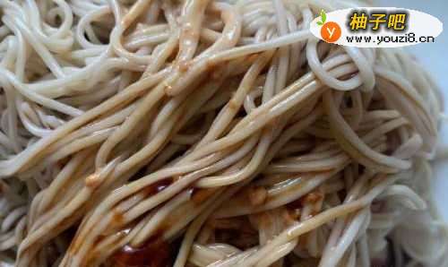 6当面条煮的沸腾的时候,赶紧捞出,把多余的水份过滤掉,然后倒一点香油进行均匀搅拌。(强调一下:千万别要面条全部粘在一起了,那样就事倍功半了)