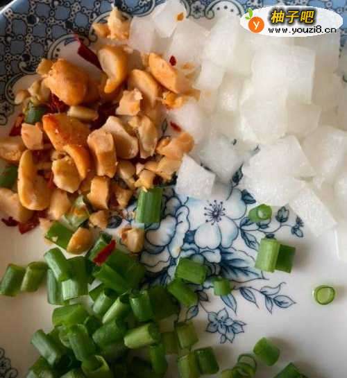 4将萝卜丁,葱花,花生放在一个盘子中。