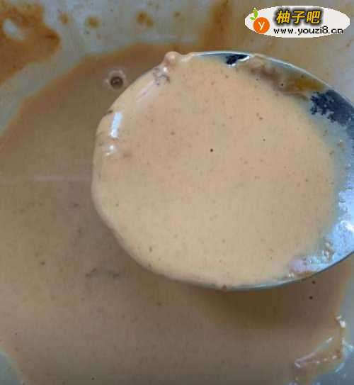 7接下来,再倒入芝麻酱,还有步骤三调好的料,然后进行均匀搅拌、