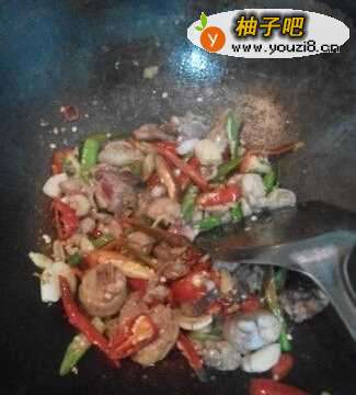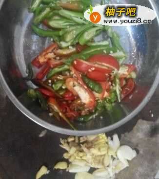 44、加入姜,蒜头继续翻炒1分钟,然后加入辣椒,炒2分钟,加入盐,可以少加盐再加酱油。也可以不用酱油这里就看个人口味了.