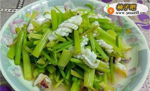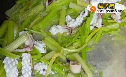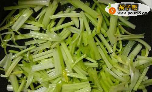 4下芹菜,略微翻炒后,加一杯水稍微焖煮三分钟。