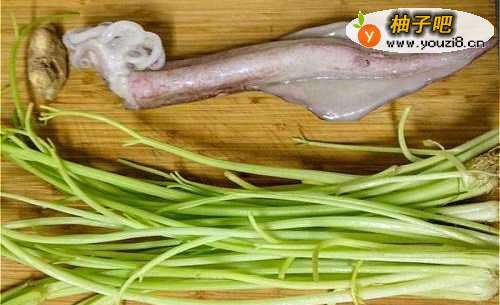准备食恩态材,鱿鱼退冰后即可处昆糟理,姜洗净外表泥土,芹菜去除根部。