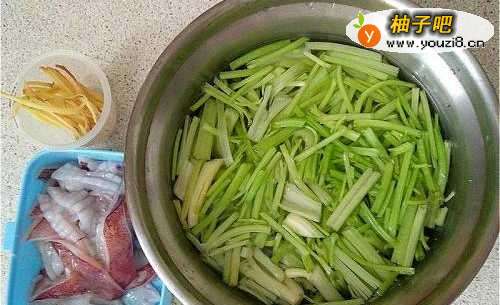 2芹菜洗净切霜包芬段,先泡水避免老化,姜切丝,鱿鱼洗净切片,用一小匙米酒腌一下。