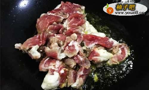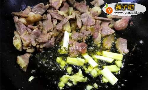 5瘦肉炒断生后,放入姜和葱炒出香味。